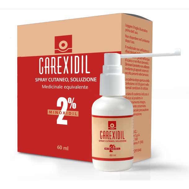 Principi Attivi 100 ml di Carexidil 2% spray cutaneo, soluzione contengono 2 g di minoxidil. Eccipienti con effetti noti: alcol etilico, glicole propilenico Per l’elenco completo degli eccipienti, vedere paragrafo 6.1. Eccipienti Alcool etilico 96%, glicole propilenico e acqua depurata. Indicazioni terapeutiche Carexidil è indicato nel trattamento sintomatico dell’alopecia androgenica in uomini e donne. Non è stata determinata l’efficacia di Carexidil nelle seguenti forme: alopecia congenita localizzata o generalizzata; alopecia cicatriziale di varia natura (post-traumatica, di origine psichica o infettiva); alopecia acuta diffusa da sostanze tossiche, da medicamenti in cui la ricrescita di capelli è condizionata dalla soppressione della causa specifica; area celsi. Controindicazioni/Effetti indesiderati Ipersensibilità al principio attivo o ad uno qualsiasi degli eccipienti elencati al paragrafo 6.1. Carexidil non deve essere impiegato in presenza di coronaropatie, aritmie, scompenso cardiaco congestizio o valvulopatie. Non impiegare in gravidanza e allattamento. Posologia Posologia Applicare una dose di 1 ml di Carexidil due volte al giorno, preferibilmente al mattino e alla sera, sulle aree interessate del cuoio capelluto. La dose è indipendente dalle dimensioni dell’area da trattare. La dose totale giornaliera non deve superare i 2 ml. Prima che ci si possano aspettare prove di crescita dei capelli, può essere necessario attendere 3-4 mesi di applicazioni due volte al giorno. L’inizio di tali segni e la loro intensità variano da paziente a paziente. In tutti i casi il medico dovrà valutare l’opportunità di sospendere il trattamento se entro 4 mesi non si osserva alcun risultato terapeutico. Se si verifica una ricrescita, è necessario proseguire con l’applicazione di Carexidil due volte al giorno affinché la crescita dei capelli continui. La ricaduta allo stato di pre-trattamento a seguito della sospensione della terapia si verifica entro 3-4 mesi. Popolazioni speciali L'uso di Carexidil non è raccomandato nei pazienti di età superiore ai 55 anni a causa della mancanza di dati sulla sicurezza e l'efficacia. Popolazione pediatrica L'uso di Carexidil non è raccomandato nei bambini al di sotto dei 18 anni, a causa della mancanza di dati sulla sicurezza e l'efficacia. Modo di somministrazione Usare Carexidil solo seguendo le istruzioni. Applicare Carexidil solo su capelli e cuoio capelluto completamente asciutti. I capelli non devono essere lavati dopo aver applicato Carexidil. Non applicare Carexidil in altre aree del corpo. Dopo aver applicato Carexidil lavarsi le mani con cura. Durante il trattamento con Carexidil, possono essere utilizzati altri prodotti cosmetici per capelli, seguendo le istruzioni sotto riportate: - utilizzare uno shampoo delicato. - è necessario lasciare penetrare Carexidil nel cuoio capelluto prima di utilizzare prodotti per l'acconciatura. Non mescolare con altre preparazioni da applicare sul cuoio capelluto. - non vi sono informazioni disponibili sull'eventualità che trattamenti con tinta per capelli o permanente alterino l'effetto di Carexidil. Tuttavia, per evitare una possibile irritazione del cuoio capelluto, il paziente deve accertarsi che Carexidil sia stato completamente lavato via dai capelli e dal cuoio capelluto prima di utilizzare questi prodotti chimici. Istruzioni per l’uso 10 pulsazioni equivalgono ad 1 ml di soluzione erogata. Svitare il tappo bianco in polipropilene. Inserire l’applicatore spray sul flacone ed avvitare saldamente. Applicare l’estensore sullo stelo, premere per fissarlo saldamente. Orientare l’estensore verso l’area da trattare, spruzzare una volta e distribuire Carexidil con la punta delle dita sull’area da trattare. Ripetere l’operazione per un totale di 10 volte per raggiungere l’applicazione di una dose di 1 ml di soluzione. Evitare di inalare i vapori. Conservazione Nessuna speciale precauzione per la conservazione. Avvetenze I pazienti che si prevede di sottoporre a terapia con Carexidil devono avere un'anamnesi ed essere sottoposti ad esami fisici. Il medico deve appurare che il paziente abbia un cuoio capelluto normale e sano, ad esempio non arrossato, infiammato, infetto, irritato o dolente. Il minoxidil non è indicato quando non vi è anamnesi familiare di perdita dei capelli, la perdita dei capelli è improvvisa e/o a chiazze, causata dal parto o quando la sua causa è ignota. Con l'utilizzo di minoxidil, alcuni pazienti hanno manifestato modifiche del colore e/o della struttura dei capelli. Può verificarsi un aumento della caduta dei capelli a causa dell'azione del minoxidil di mutazione dei capelli dalla fase telogen di riposo alla fase anagen di crescita (i vecchi capelli cadono quando i nuovi capelli crescono al loro posto). Generalmente questo aumento temporaneo della caduta si verifica tra due e sei settimane dopo l'inizio del trattamento e si riduce entro un paio di settimane (primo segnale dell'efficacia del minoxidil). Se la caduta persiste, gli utilizzatori devono interrompere l'utilizzo di Carexidil e consultare il medico. L'uso, specie se prolungato, dei prodotti per uso topico può dare origine a fenomeni di sensibilizzazione. In tal caso, interrompere il trattamento e consultare il medico per istituire idonea terapia. Benché estesi studi clinici effettuati con minoxidil non abbiano dimostrato che vi sia un assorbimento di questo principio attivo sufficiente a causare effetti sistemici, si verifica un certo assorbimento di minoxidil attraverso il cuoio capelluto ed esiste il rischio potenziale di effetti sistemici quali ritenzione di sali e liquidi, edema generalizzato e locale, effusione pericardica, pericardite, tamponamento cardiaco, tachicardia, angina o aumento dell'ipotensione ortostatica indotta da farmaci antiipertensivi come la guanetidina e derivati. In presenza di disturbi cardiovascolari, compresa l'ipertensione, è necessaria attenta valutazione 